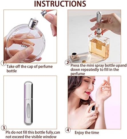 🌻【Easy to Refill】: First of all, Remove the cap of atomiser spray bottle, and press the nozzle few times to exhaust the air inside. Secondly, take off the cap of perfume bottle, then let the bottom of the mini spray bottle aim at the straw, and finally press the mini spray bottle up and down repeatedly to fill in the perfume.