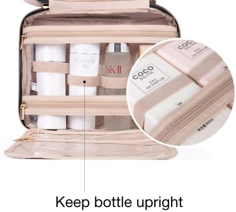 Special Design – Inner main pockets with elastic straps hold bottles upright; Double zipper compartment for easy access the items even not full-opened the bag; Transparent sides for providing clear overview of contents.
