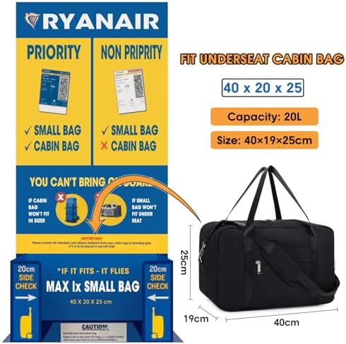 ✅ PAY ATTENTION TO THE SIZE – Decent size with 20L capacity is the maximum size of person item bag when flying with Ryanair. Lager needs for this small bag may not be met. Other larger cabin bags are also available in our store catering to broader demands.