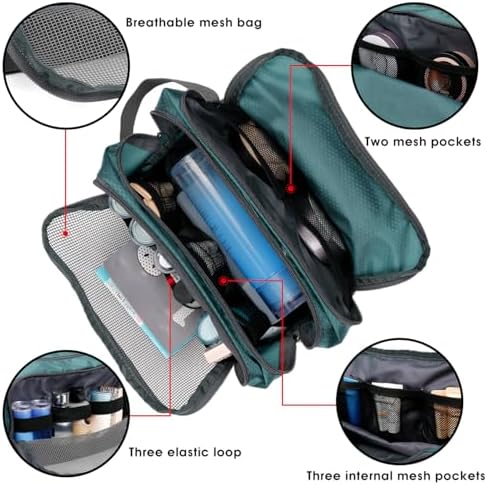 【ORGANIZED COMPARTMENTS】 — The main compartment holds larger items such as shampoo bottles or shaving cream. A zippered mesh pouch keeps your smaller toiletries and cosmetics visible and breathable. Another front zipper pocket on the side provides extra storage with ease.